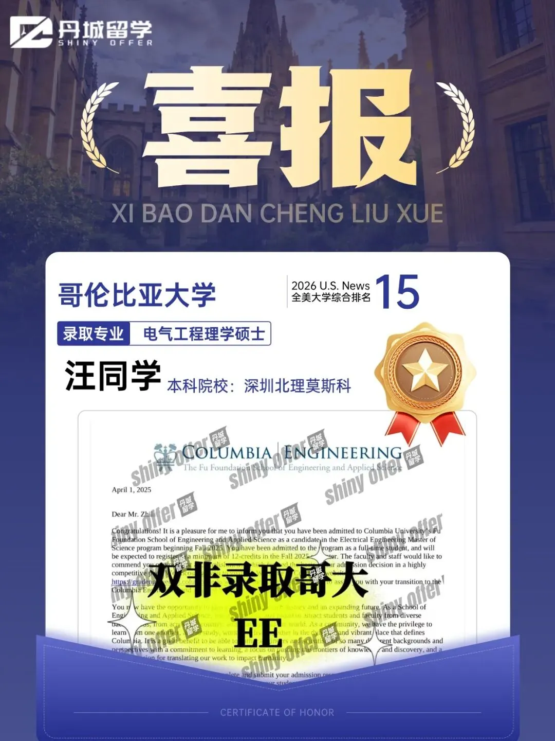 汪同学是我们的家族口碑学员,本科就读于深圳北理莫斯科大学(双非院校)计算机专业,在低绩点的背景劣势下,凭借我们全程定制化的专业申请规划与辅导,成功逆袭斩获哥伦比亚大学(2026 U.S. News 全美大学综合排名第 15)电气工程理学硕士(计算机相关方向)录取,书写了双非低绩点冲刺藤校顶尖工科项目的逆袭传奇。