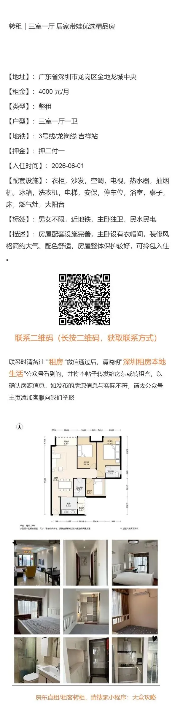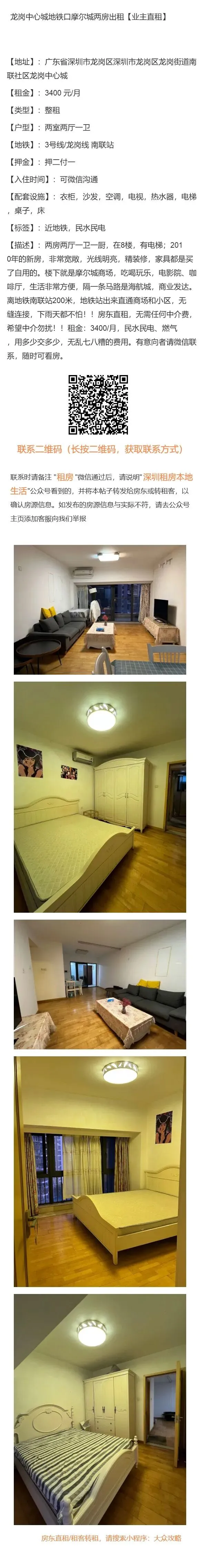 【深圳租房本地生活:免责申明】以上内容受用户委托发布,谢绝转载。房源信息的真实性、合法性由提供者负责,本公众号不声明或保证内容之正确性和可靠性,深圳租房需谨慎,请先核实出租人身份,仔细阅读租房合同,切勿轻易转账、交订金等,房屋出租过程中产生的一切问题,与本公众号无关。【深圳租房本地生活:特别申明】深圳租房本地生活没有任何线下业务人员,请勿轻信冒认我司线下工作人员及电话沟通人员,我司目前唯一对外沟通窗口为公众号主页客服微信:Hey_Beijinger