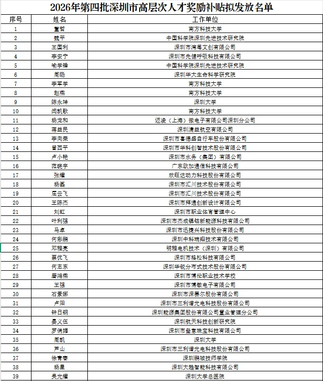2026年第四批深圳市高层次人才奖励补贴拟发放名单公示根据《关于进一步完善深圳市高层次人才奖励补贴发放有关事项的通知》(深人社规〔2022〕1号)等文件有关规定,我局已完成2026年第四批深圳市高层次人才奖励补贴的审核工作,现按要求将名单予以公示(见附件)。