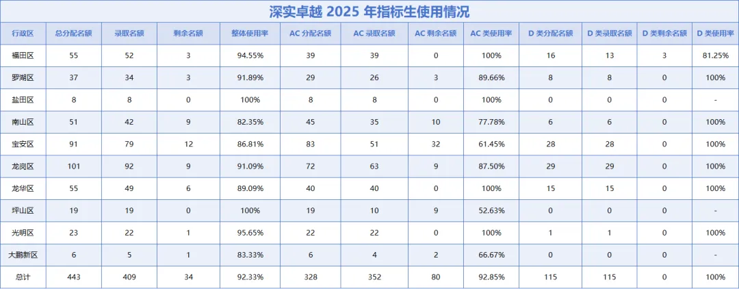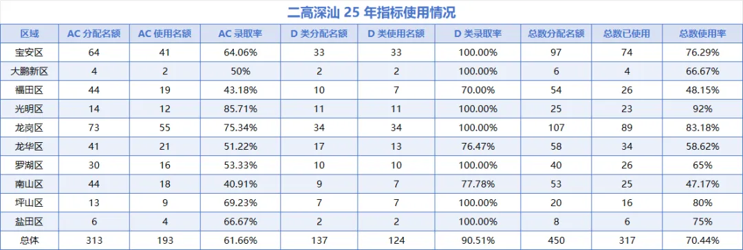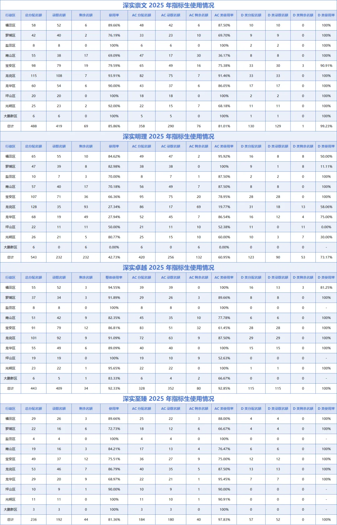 高热度满额校:深高有为(95.45%)、深实卓越(90.07%)、深实崇文(85.86%),指标几乎录满,竞争激烈,适合高分段考生冲刺