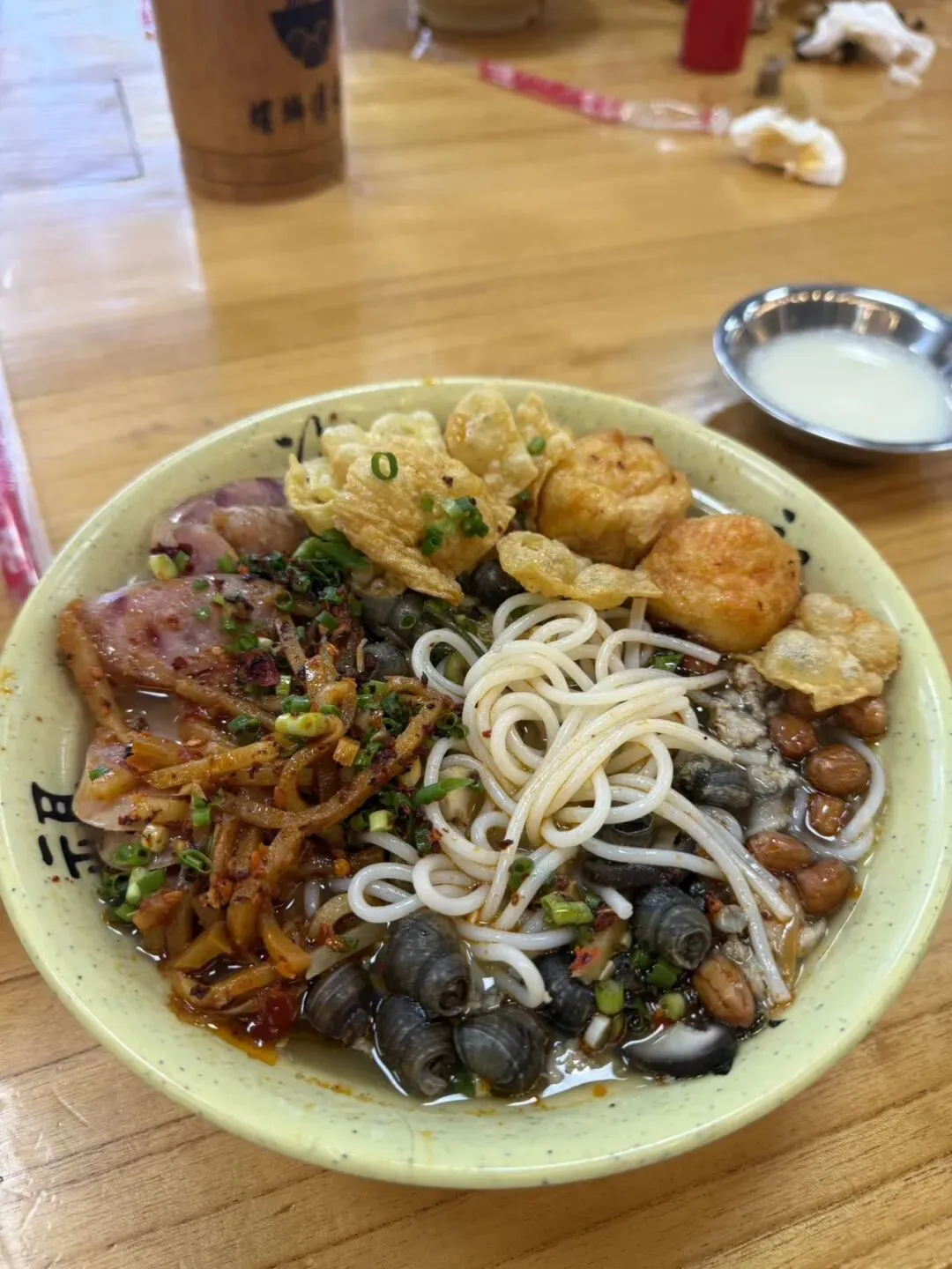 抵达漓江后,先在兴坪古镇吃了一顿丰盛的早餐(螺蛳粉),补充能量,准备迎接重头戏。吃了两顿螺蛳粉,为何要写呢,因为这阿姨非常热情,亲切,问我哪里来的,一直让免费加小料,陪我聊天,给我介绍他们的工作内容,耐心解答我的好奇点,吃完离开时送了一瓶可乐给她,她说我真的很客气,我想,只是很喜欢,肯定她做的螺蛳粉,希望有缘去广西还能遇见,祝身体健康,平安喜乐。1. 登顶老寨山·俯瞰漓江全景