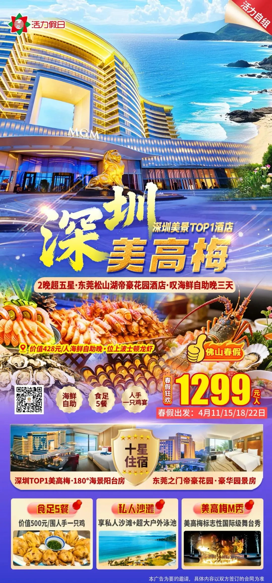 4月11、15日铁发!深圳美高梅,狮王气势的酒店!全海景房!踏浪看海,精彩M秀!松山湖帝豪花园!位上龙虾自助晚+人手一只鸡宴!顶级三天