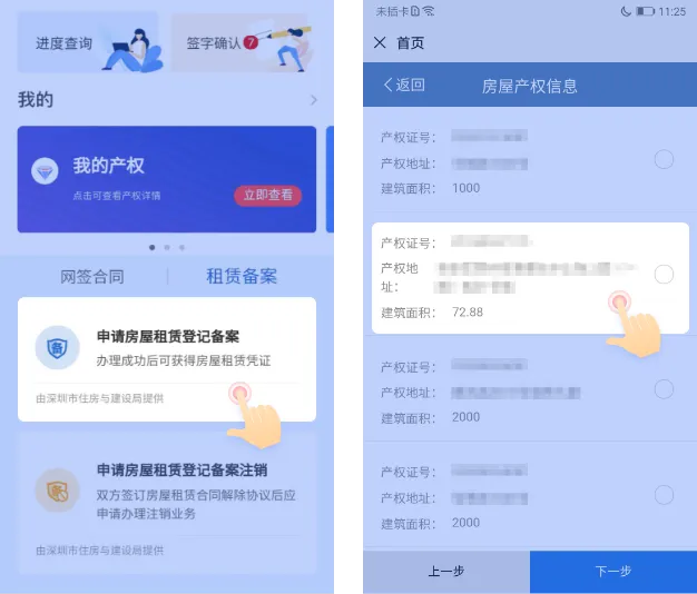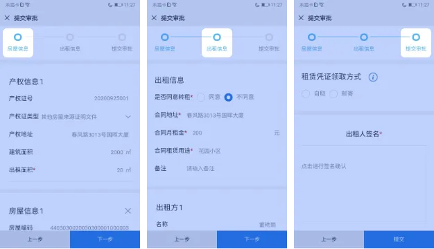 进入“申请房屋租赁登记备案”- 选择产权 - 填写表单信息,提交审批