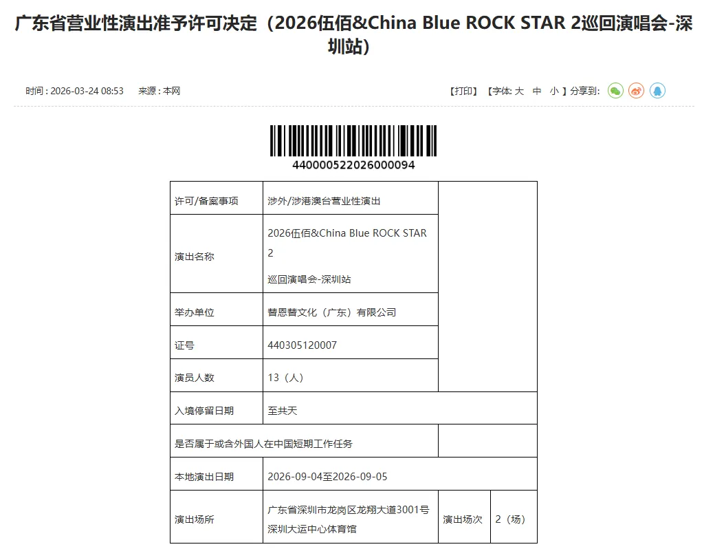 ✅演出项目:2026伍佰&China Blue ROCK STAR 2深圳演唱会