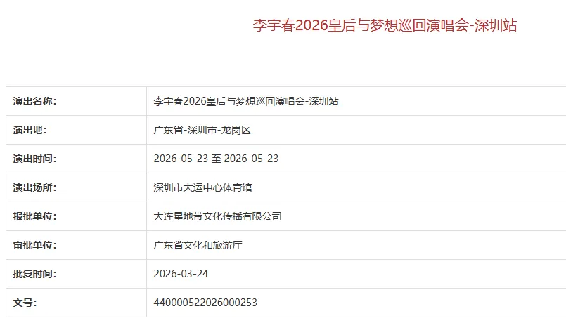 ✅演出项目:2026李宇春皇后与梦想巡回演唱会-深圳站