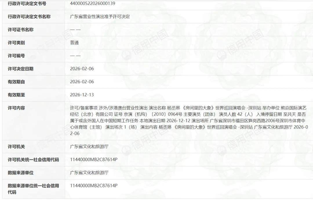✅演出项目:杨丞琳《房间里的大象》世界巡回演唱会-深圳站