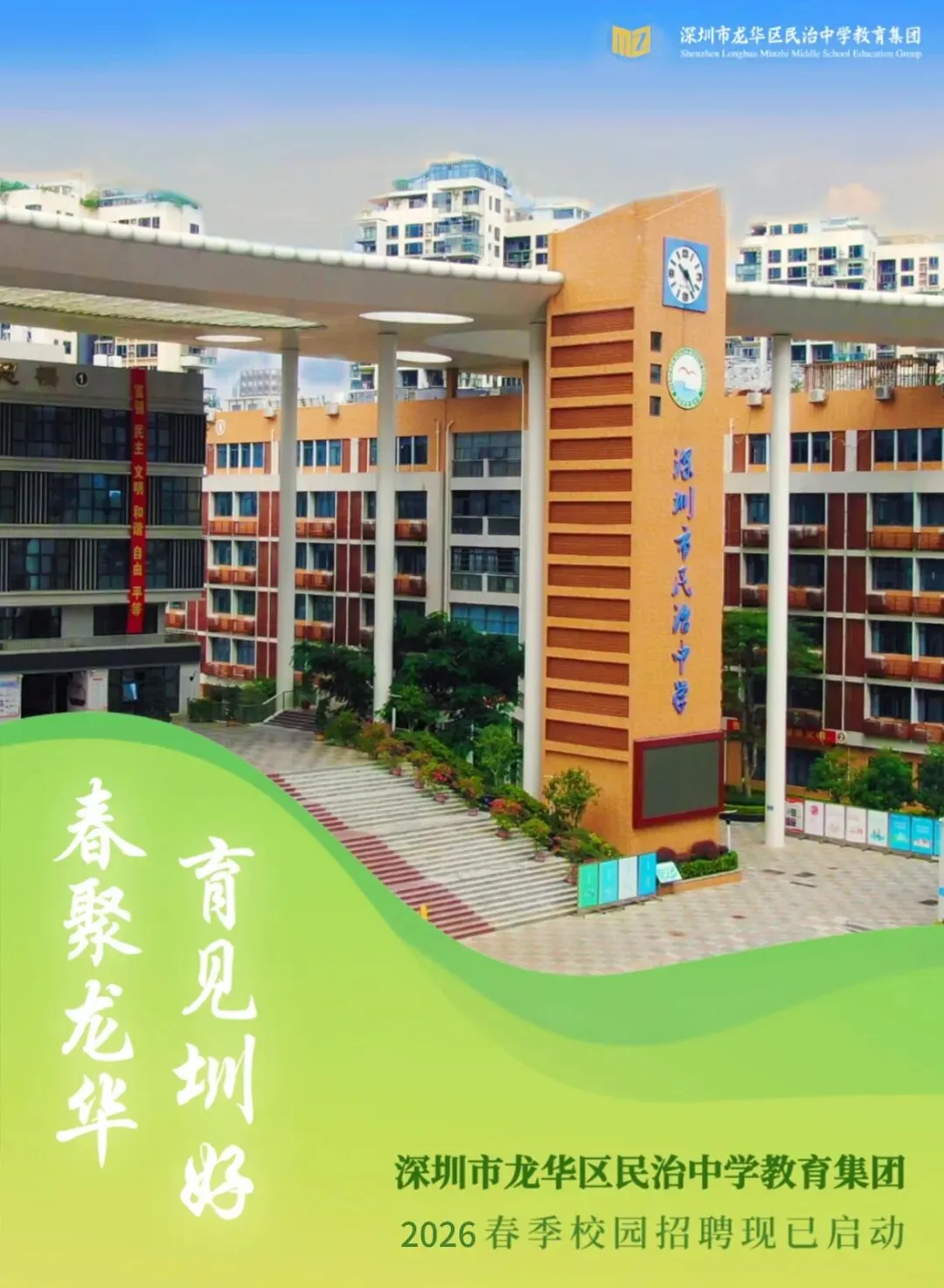 民新学校是龙华区政府高标准打造的一所面向未来、具有创美创新典范的九年一贯制公办学校,创办于2020年9月,校园占地面积约21166平方米,现有59个教学班,学生2769人,教职工198人。学校地处深圳中轴核心片区,毗邻深圳市美术馆、深圳市图书馆、开心麻花剧场和深圳北站,交通便利,独具现代都市文艺气质。