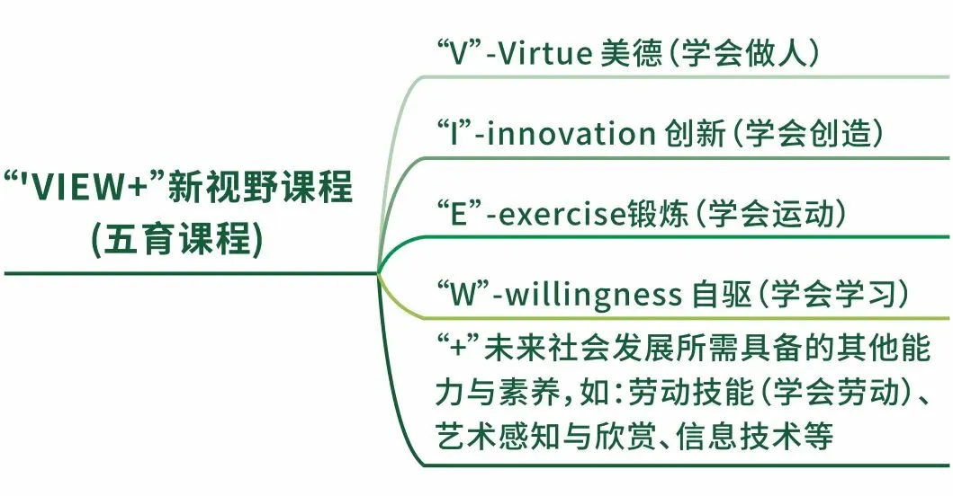 学校紧扣义务教育课程指导思想与未来人才培养导向,以“成就开放胸襟和思维的未来人才”为育人目标,构建“VIEW+”新视野课程,并打造“启智、增智、创智”进阶式科学特色课程,以丰富多元、自主选择的课程设置,丰盈学生学习经历,助力学生个性发展。