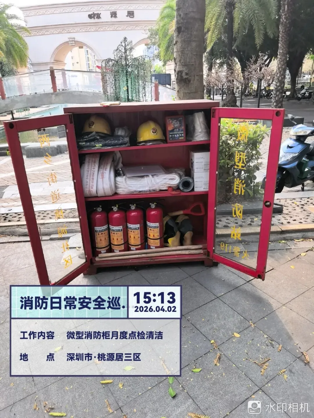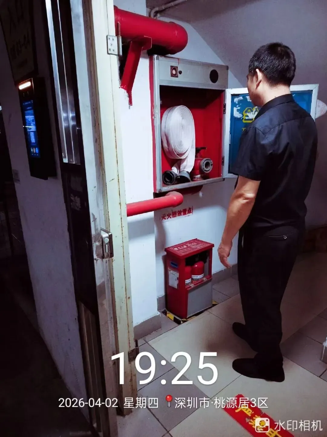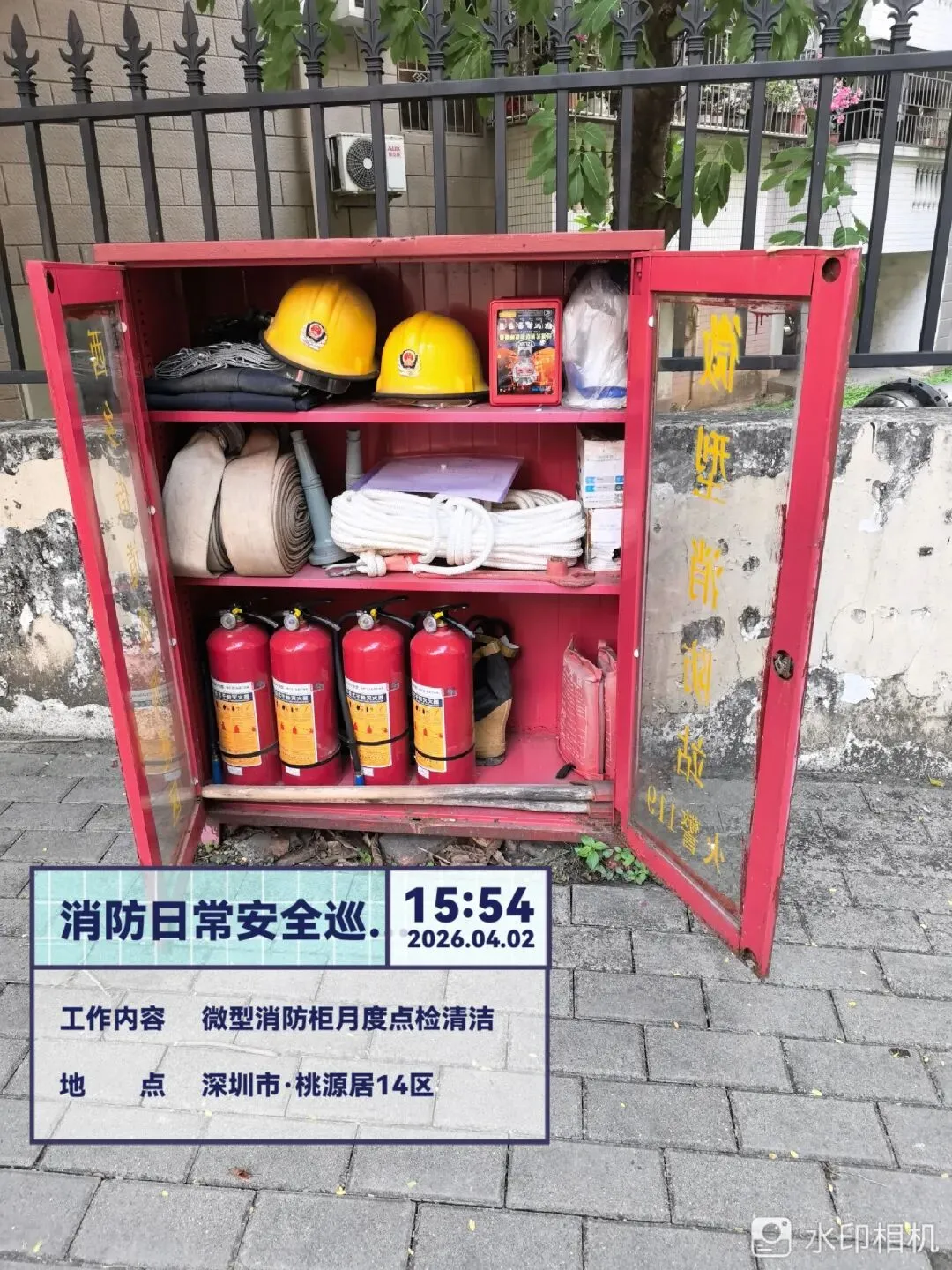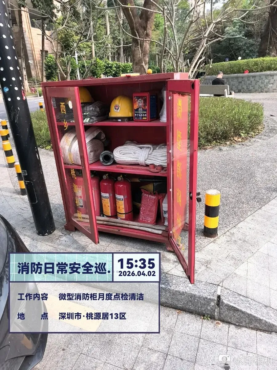 对室外的微型消防柜进行检查。