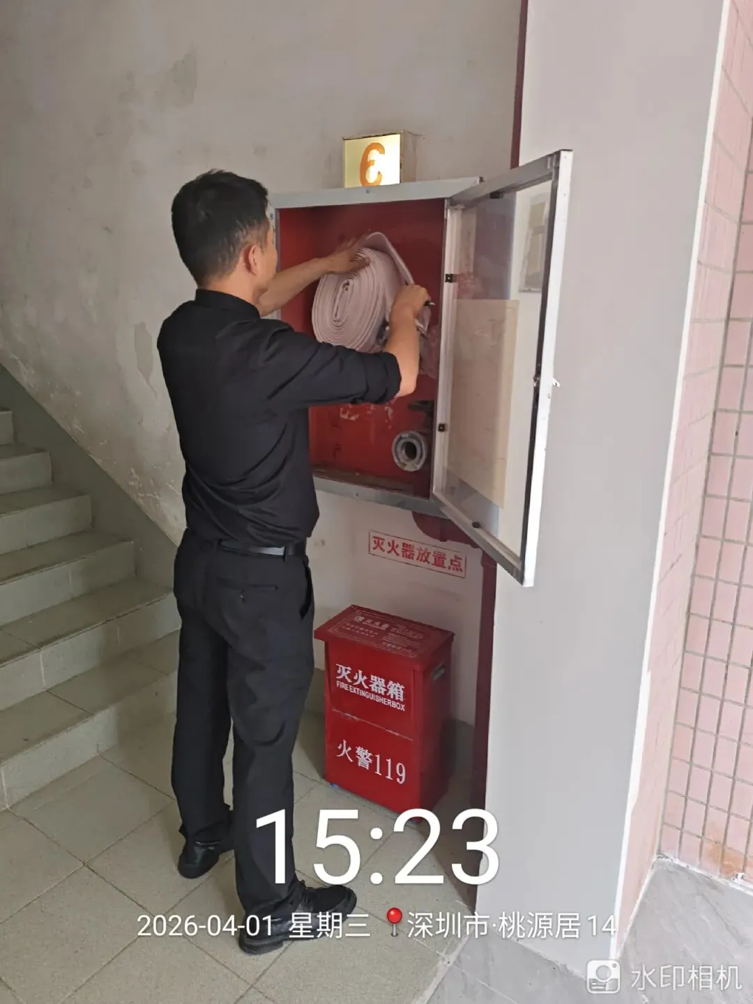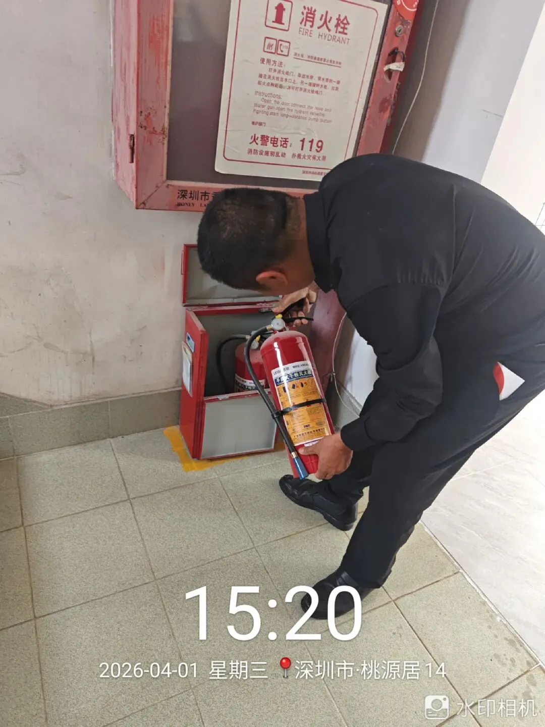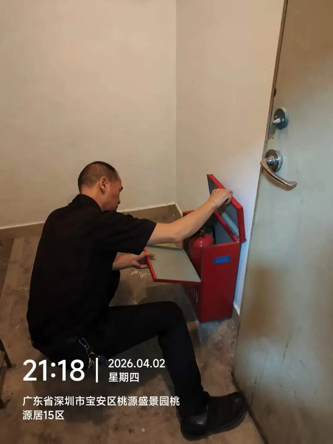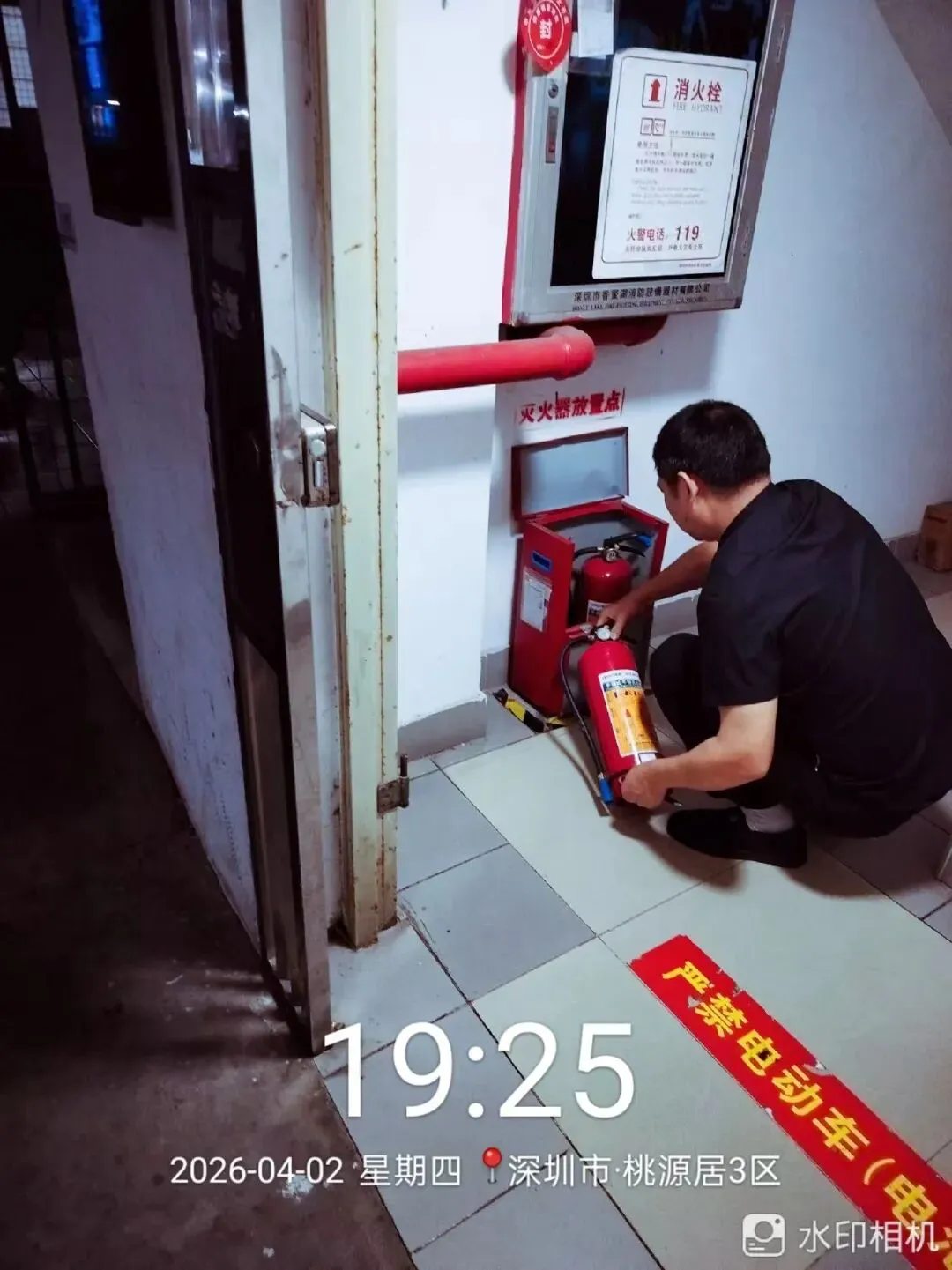 对室外的微型消防柜进行检查。