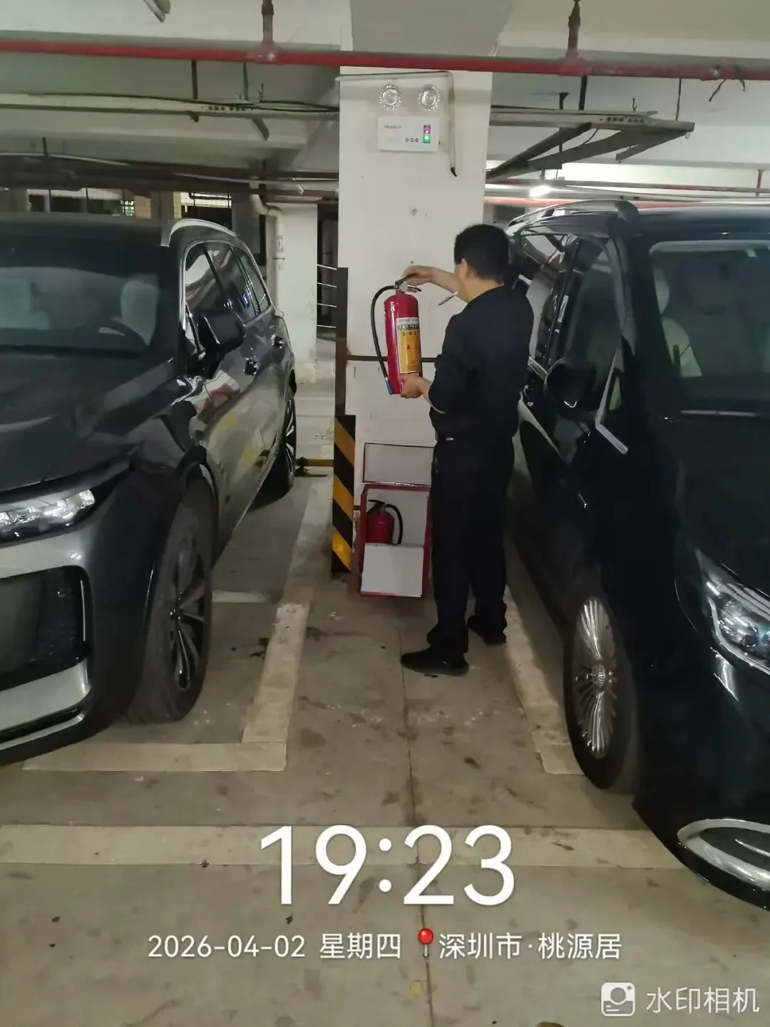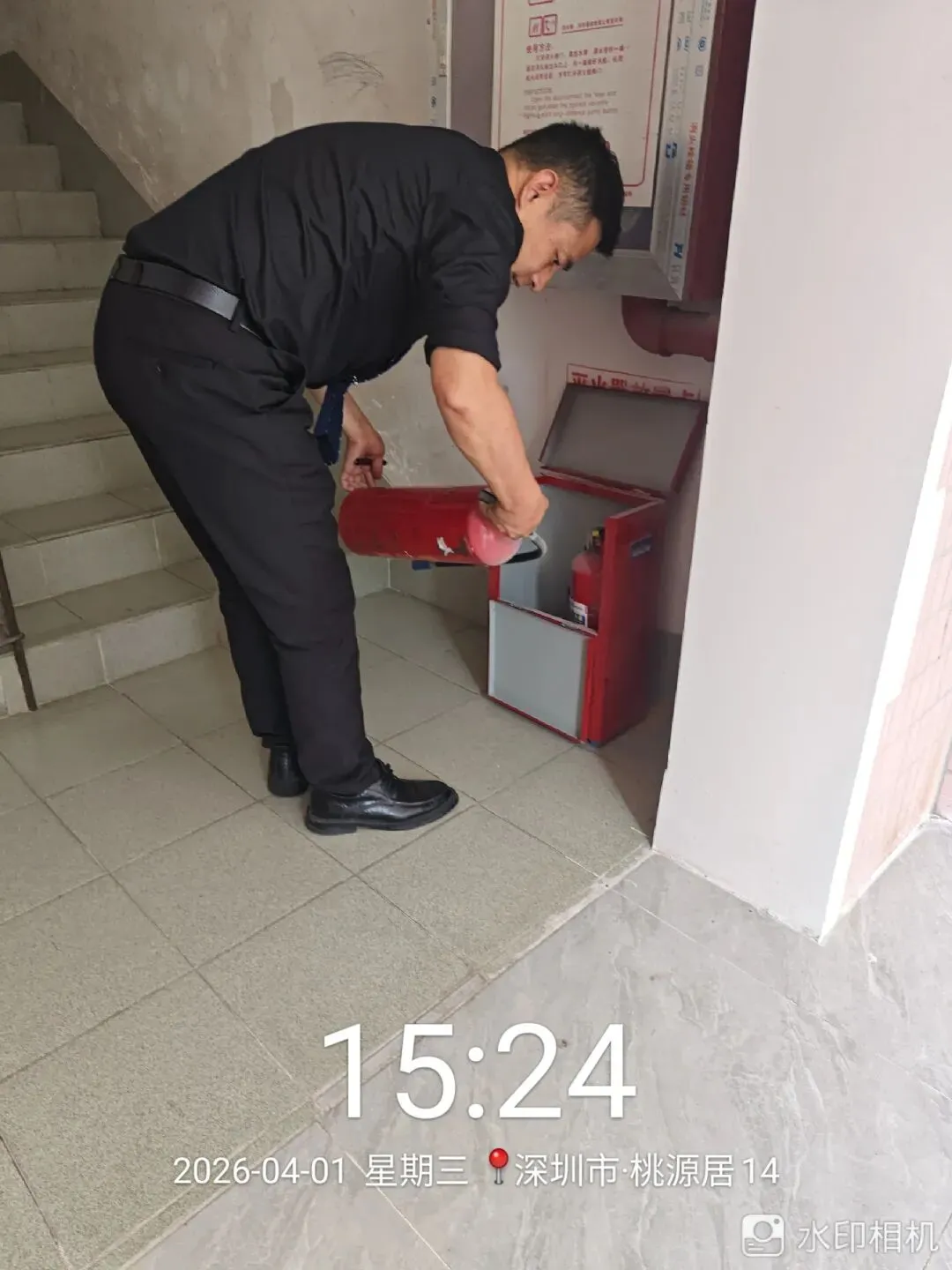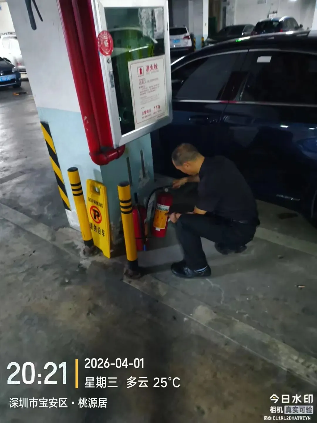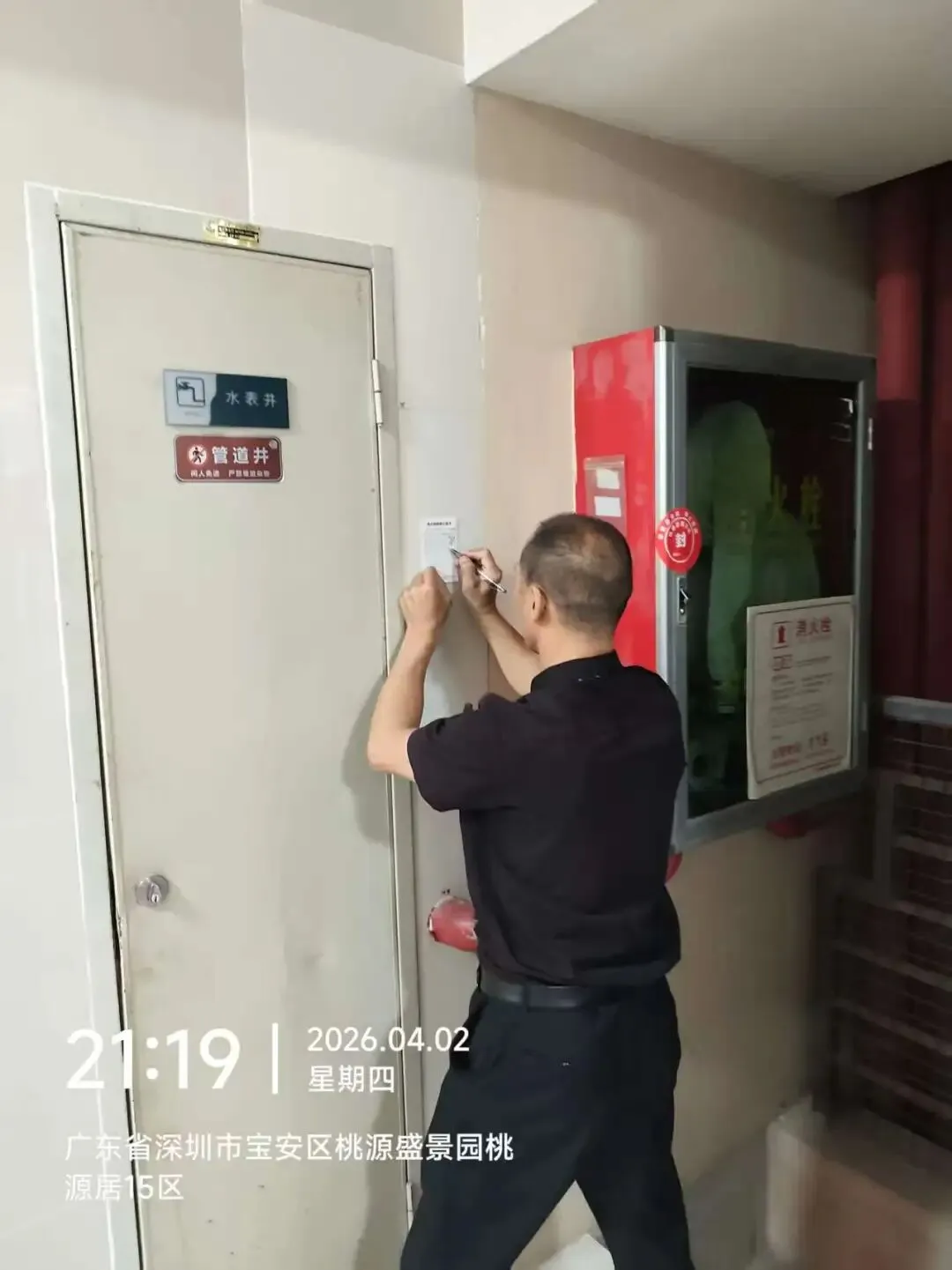 对室外的微型消防柜进行检查。