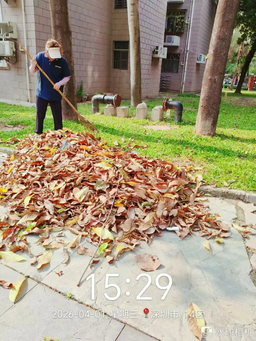 清扫草坪落叶。