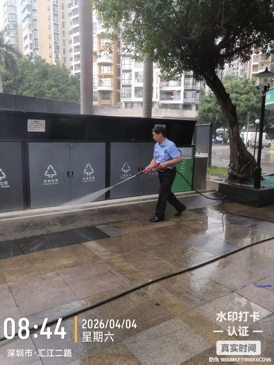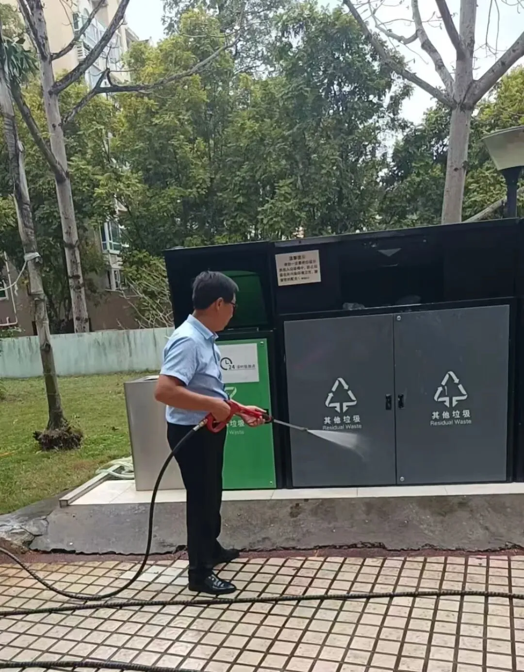 冲洗车库地面及垃圾分类点污渍。