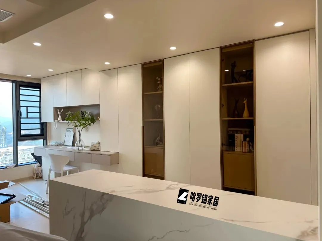 2. 防潮抗造,适配深圳气候刚需 深圳地处南方,梅雨季潮湿、沿海气候多盐雾,传统木质柜体极易受潮变形、发霉发黑,不仅影响美观,更会滋生细菌、释放甲醛,成为装修隐形痛点。 而哈罗铝家居自带防水防潮、防霉防蛀、防火阻燃的天然属性,铝合金基材不惧潮湿侵蚀、不怕阳光暴晒,即使是阳台、厨卫等高湿高盐环境,也能长期保持结构稳定,不变形、不生锈、不发霉。同时,采用专利焊接板工艺与四合一连接件,结构稳固,承重能力强,使用寿命远超传统板材,真正实现“一套家具用几十年”的耐用承诺。