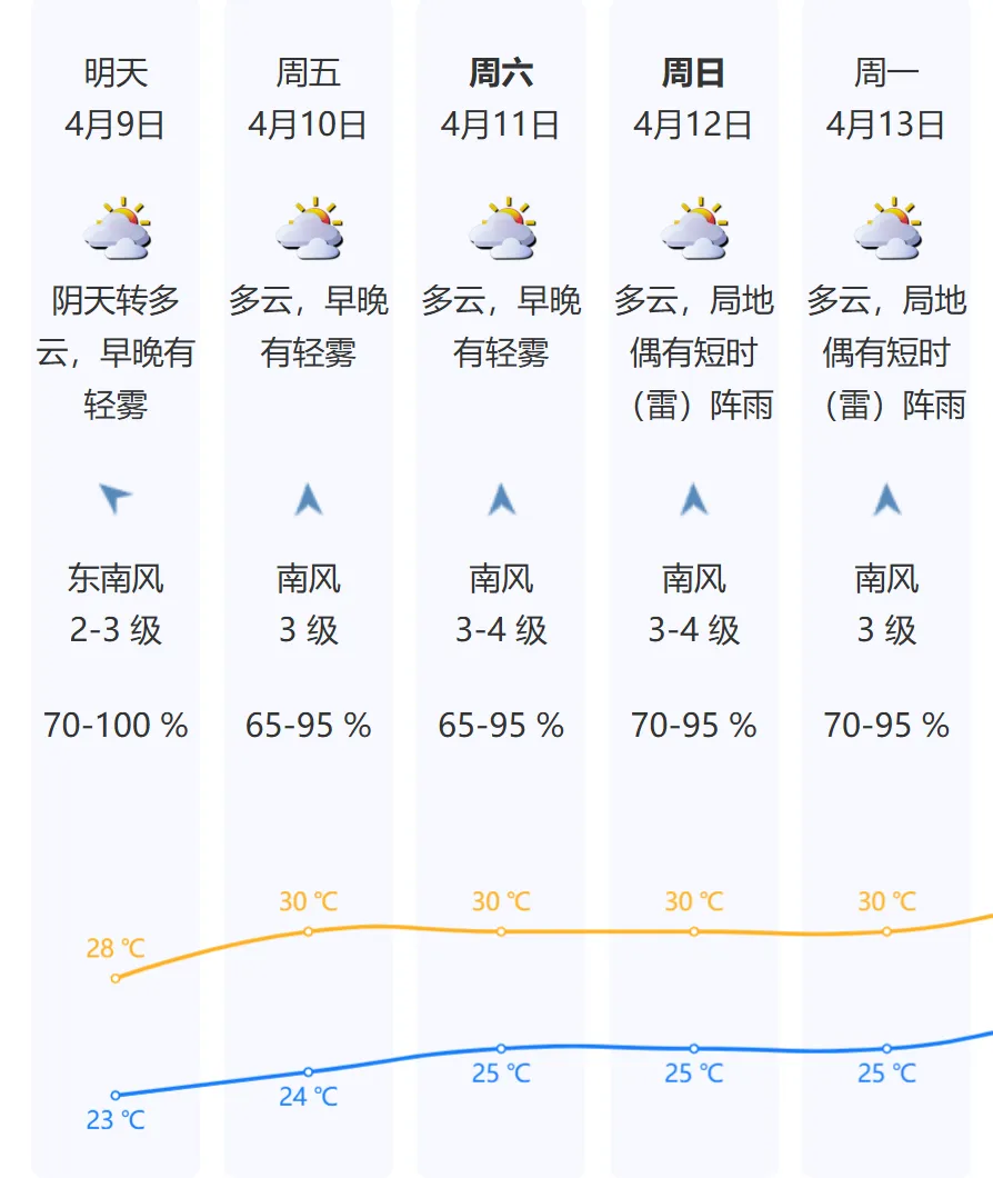 4月10日—13日多云,午间较热,间中局地偶有短时(雷)阵雨,早晚有轻雾。