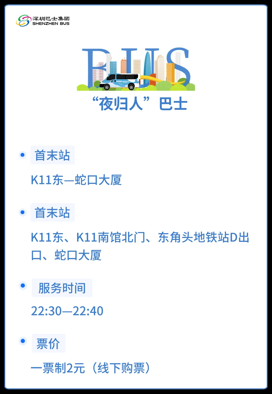 3月13日,深圳首趟“夜归人巴士”上线。每晚10点半准时停靠在K11东公交接驳站,终点至蛇口大厦,全程约13分钟,大幅缩短了工作人员的夜间通勤时间。