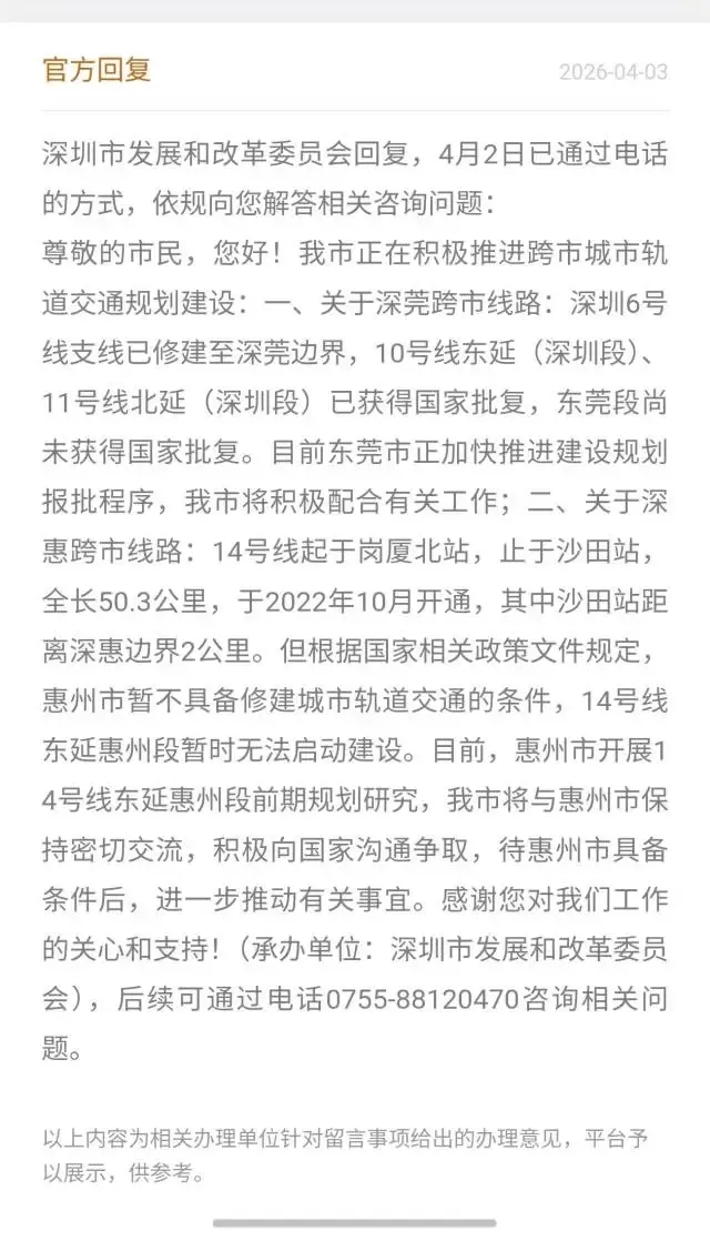 针对网友提问,2026年4月3日,深圳市发展和改革委员会回复称:14号线已开通至沙田站,距离深惠边界仅2公里,但根据国家政策,惠州市暂不具备修建城市轨道交通的条件,因此东延段无法启动建设。目前惠州市正开展前期规划研究,深圳将与惠州保持密切交流,积极与国家沟通争取,待惠州具备条件后推动后续事宜。