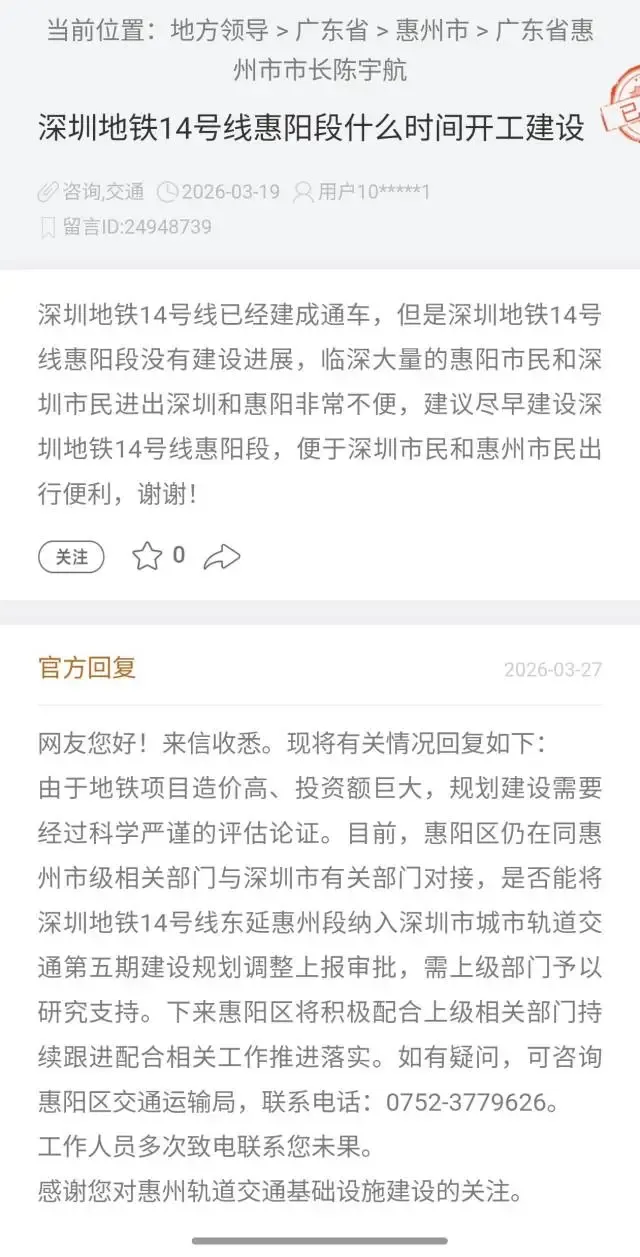 2026年3月27日,有惠州网友在人民网领导留言板上提议,惠阳区交通运输局回复表示:地铁项目造价高、投资额巨大,规划建设需经科学严谨评估。目前,惠阳区正会同惠州市级部门与深圳市有关部门对接,能否将深圳地铁14号线东延惠州段纳入深圳市城市轨道交通第五期建设规划调整并上报审批,需上级部门予以研究支持。惠阳区将积极配合上级部门持续推进相关工作。