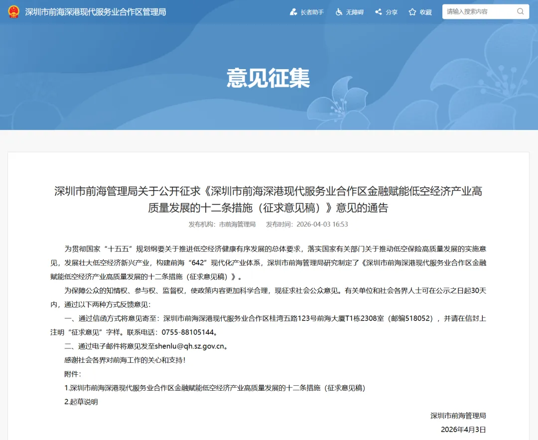 近日,深圳市前海管理局发布《深圳市前海深港现代服务业合作区金融赋能低空经济产业高质量发展的十二条措施(征求意见稿)》公开征求意见。其中提出,探索与香港交易所建立低空经济企业上市快速通道。