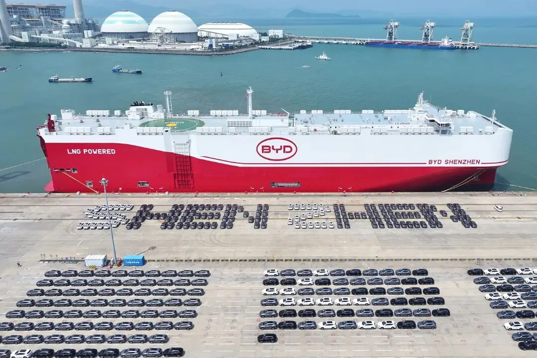 ▲2025年7月8日,广东汕尾,深汕特别合作区,比亚迪“深圳号”滚装船在深圳小漠国际物流港装载新能源汽车。图源:IC photo