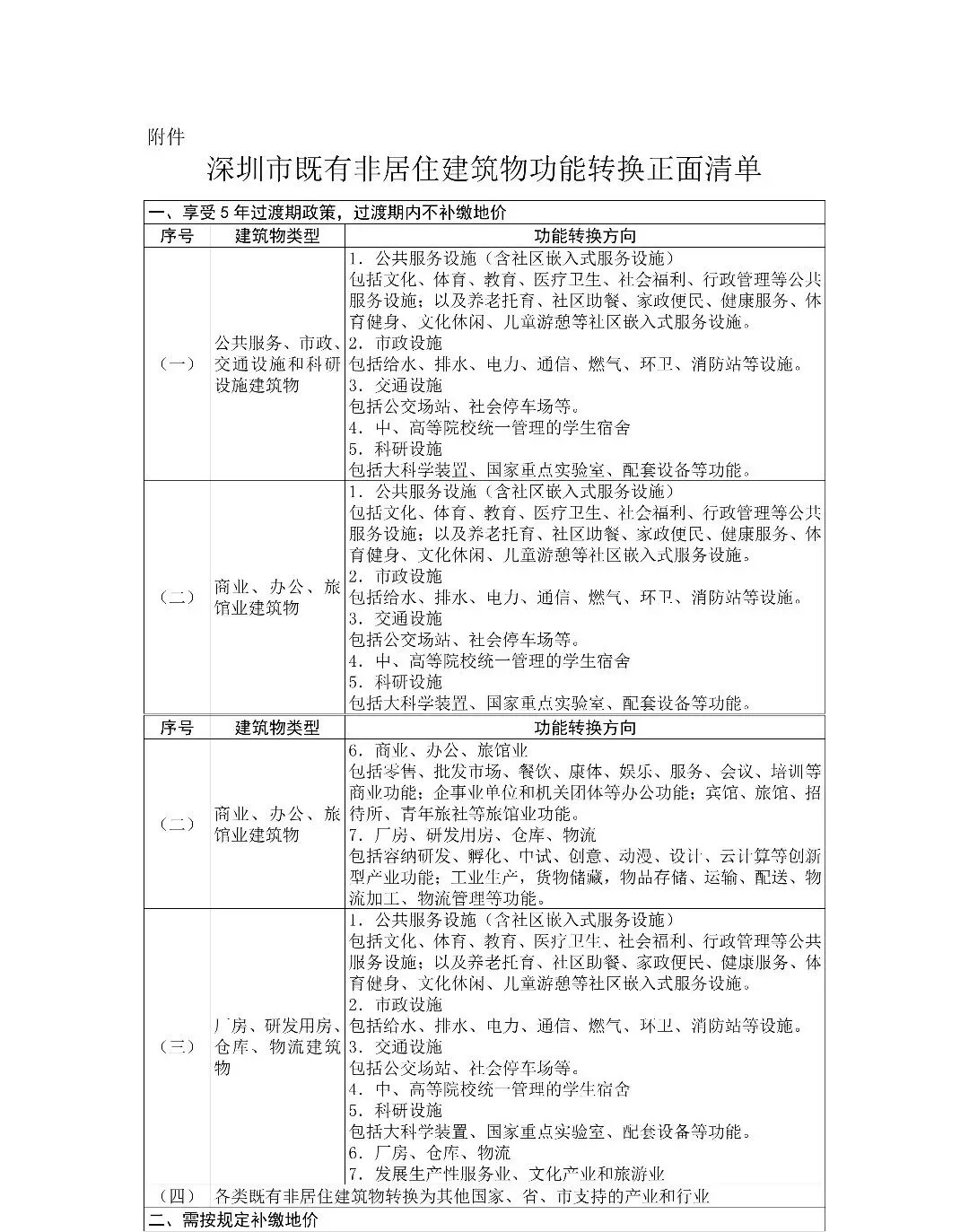 建筑功能转换项目需按深圳市地价测算规则补缴地价,其中《正面清单》内享受过渡期政策的项目5年有效期内不补缴地价。