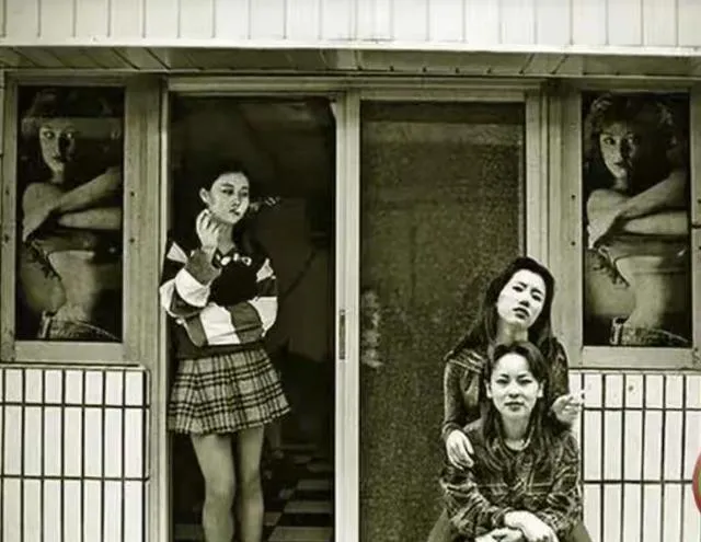 图上这仨姑娘,坐着的、蹲着的、站门口的,打扮没有一点模糊地带,领子竖得高高,裙子亮亮,胳膊挽出个花样来,脖子上的链子晃一晃闪点光,全都挺精神,门口那位嘴里夹根烟,一双眼没含糊,镜头面前也不慌不忙,看着像随意摆拍,其实谁都看得出这点劲儿就是那年头独有的东西,身旁的两个姐妹,不管是蹲在那护着还是半靠着门岗,每个人手头都没闲着,叼烟、夹烟都来,那时候发廊门口抽烟的姑娘真不少,没谁会觉得稀罕。
