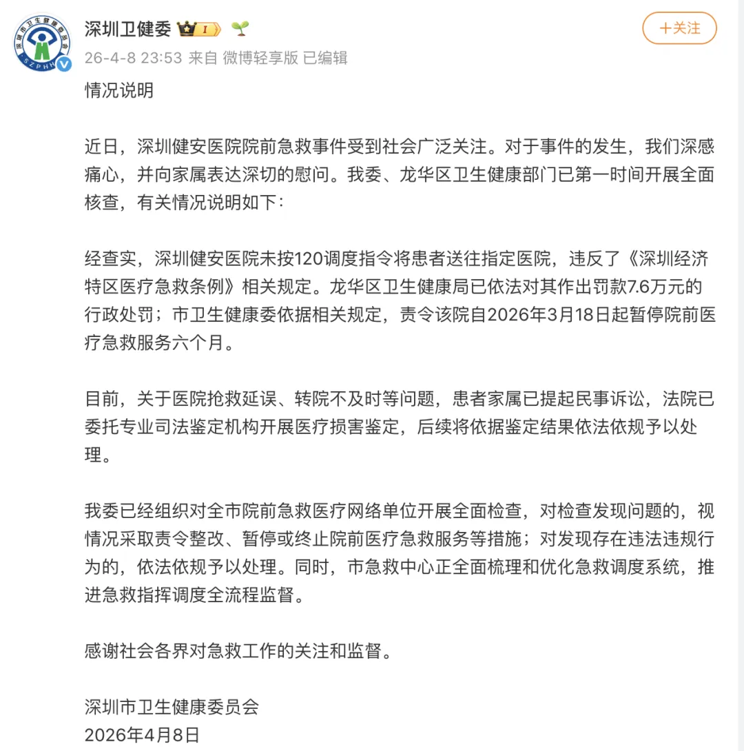 近日,深圳健安医院院前急救事件受到社会广泛关注。对于事件的发生,我们深感痛心,并向家属表达深切的慰问。我委、龙华区卫生健康部门已第一时间开展全面核查,有关情况说明如下:经查实,深圳健安医院未按120调度指令将患者送往指定医院,违反了《深圳经济特区医疗急救条例》相关规定。龙华区卫生健康局已依法对其作出罚款7.6万元的行政处罚;市卫生健康委依据相关规定,责令该院自2026年3月18日起暂停院前医疗急救服务六个月。目前,关于医院抢救延误、转院不及时等问题,患者家属已提起民事诉讼,法院已委托专业司法鉴定机构开展医疗损害鉴定,后续将依据鉴定结果依法依规予以处理。我委已经组织对全市院前急救医疗网络单位开展全面检查,对检查发现问题的,视情况采取责令整改、暂停或终止院前医疗急救服务等措施;对发现存在违法违规行为的,依法依规予以处理。同时,市急救中心正全面梳理和优化急救调度系统,推进急救指挥调度全流程监督。感谢社会各界对急救工作的关注和监督。深圳市卫生健康委员会2026年4月8日
