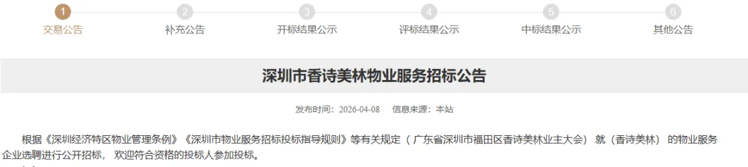 深圳市香诗美林物业服务招标公告https://wy.szggzy.com/jygg/GGdetails.html?contentId=20313916&projectCode=XMBA2026033100001A01¬iceTypeName=%E4%BA%A4%E6%98%93%E5%85%AC%E5%91%8A&crumb=sy