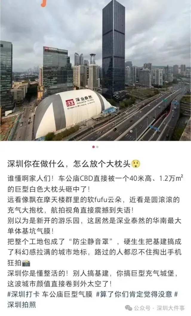 为什么要用基坑气膜把工地包裹住?南都N视频记者近日从深业泰然(集团)和沙头街道办了解到,这是由深业泰然(集团)与中建八局联合打造的车公庙泰然工业区城市更新项目,该城市更新项目位于福田区沙头街道,主要建设内容为拆除现有工业厂房,新建商业、产业研发用房、酒店于一体的综合体,有利于进一步加快车公庙片区升级改造。