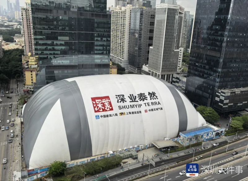 由于项目地处车公庙核心地段,紧邻密集居民区、高层写字楼与繁华步行街,同时毗邻地铁7/9号线,对施工降噪、降尘、控振要求极为严苛。如果是开放施工,周边会受到干扰,气膜=隔音罩+防尘罩,可挡住噪音和粉尘,气膜利用内外气压差实现膨胀和支撑。