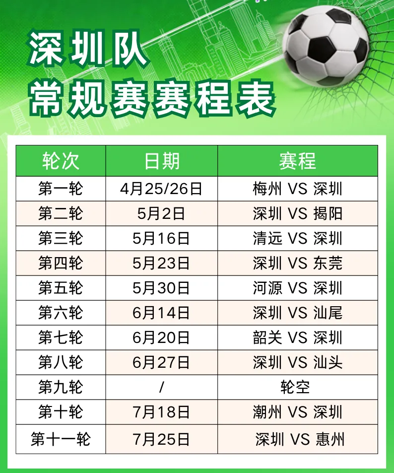 2026年广东省城市足球超级联赛将于4月25日/26日正式开赛,深圳队2026赛季常规赛赛程首次正式公布。