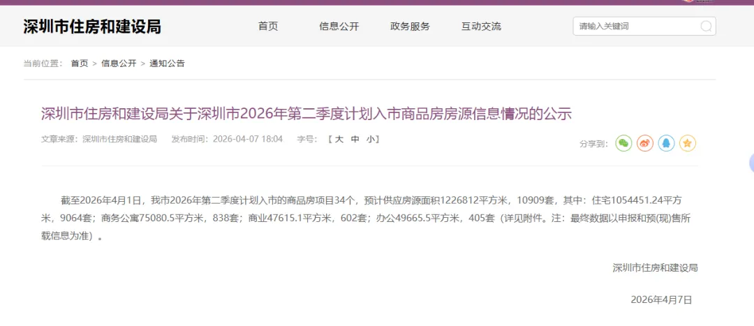 4月7日,深圳市住房和建设局正式发布2026年第二季度计划预售商品房情况,为深圳楼市二季度走势定下基调,无论刚需、改善还是投资客,都值得重点关注这份入市清单。