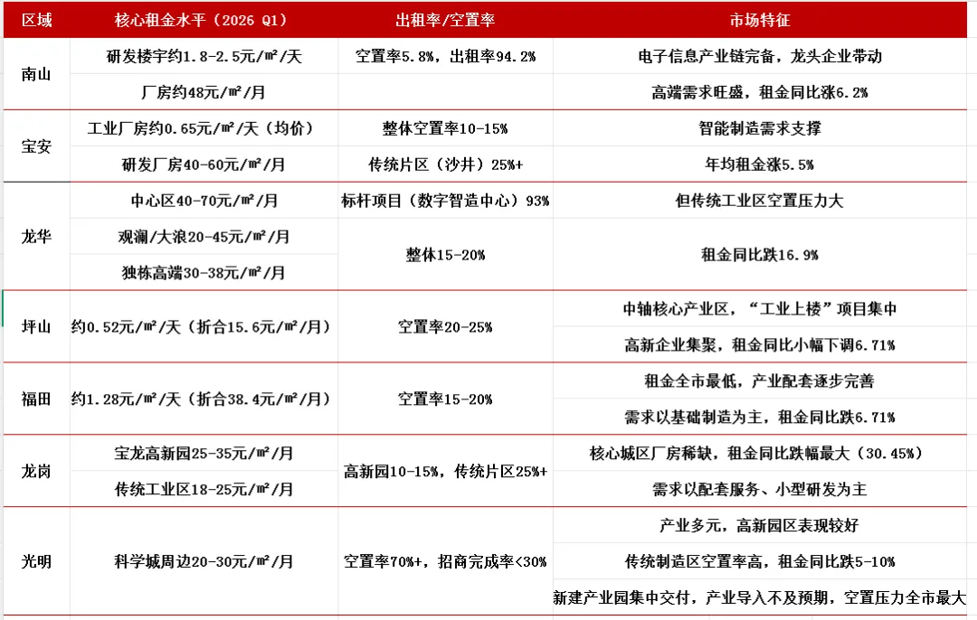 核心科创区(南山科技园)空置率仅5.8%,出租率超94%;传统工业区(宝安沙井、龙岗宝龙)空置率普遍超25%,远郊区域(光明科学城周边、深汕合作区)空置率达30%-50%,部分项目招商完成率不足30%。