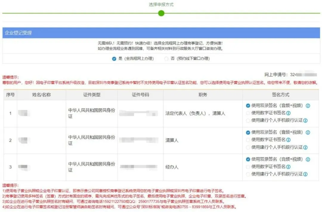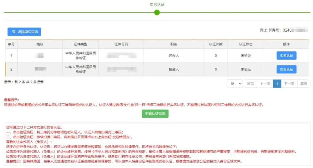 9.人员全部“实名认证 ”完成之后 ,“更新认证结果 ”,点击进入申报选择方式页 。请看 “第四节 流程办理方式 ”