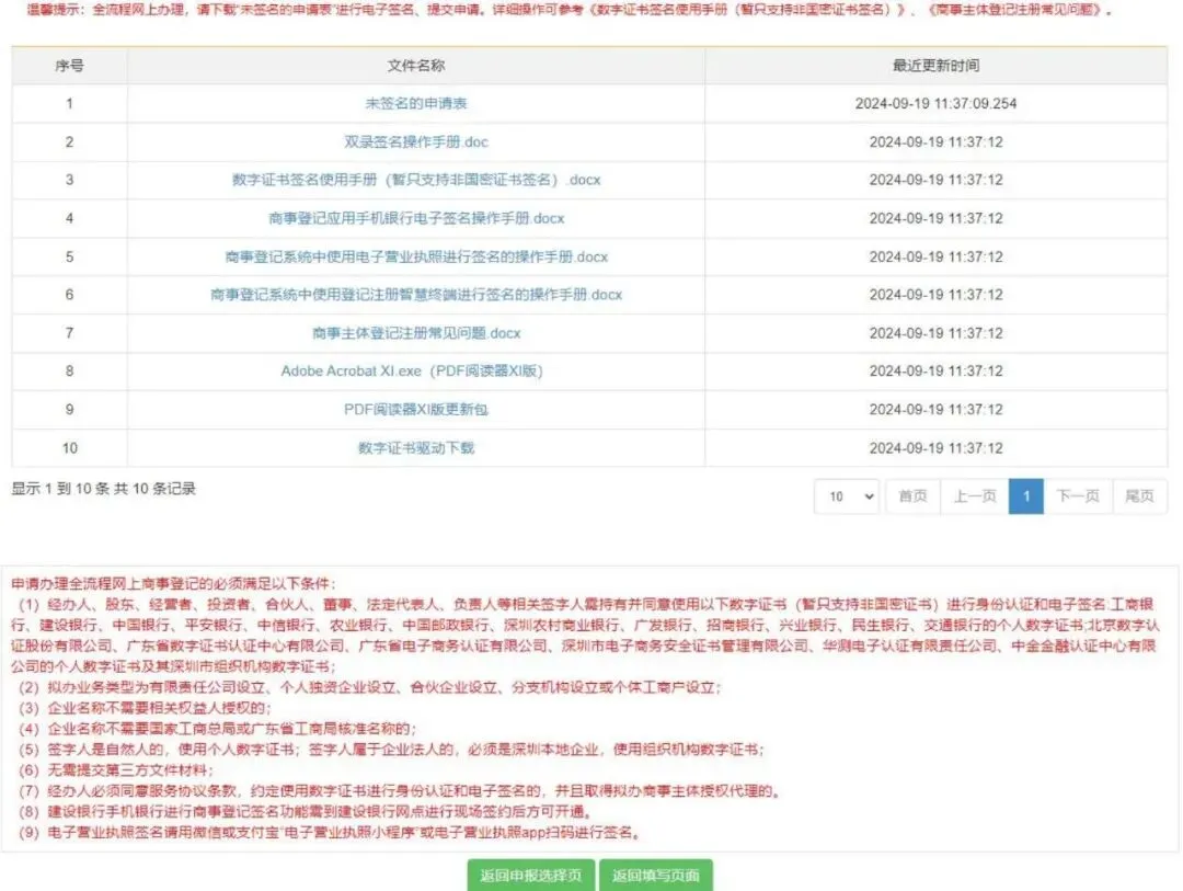 10.全流程网上办理,请下载“未签名的申请表 ”进行电子签名、提交申请。如需修改申请信息 ,点击“返回填写页面 ”。