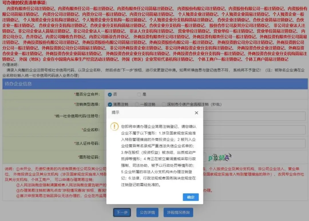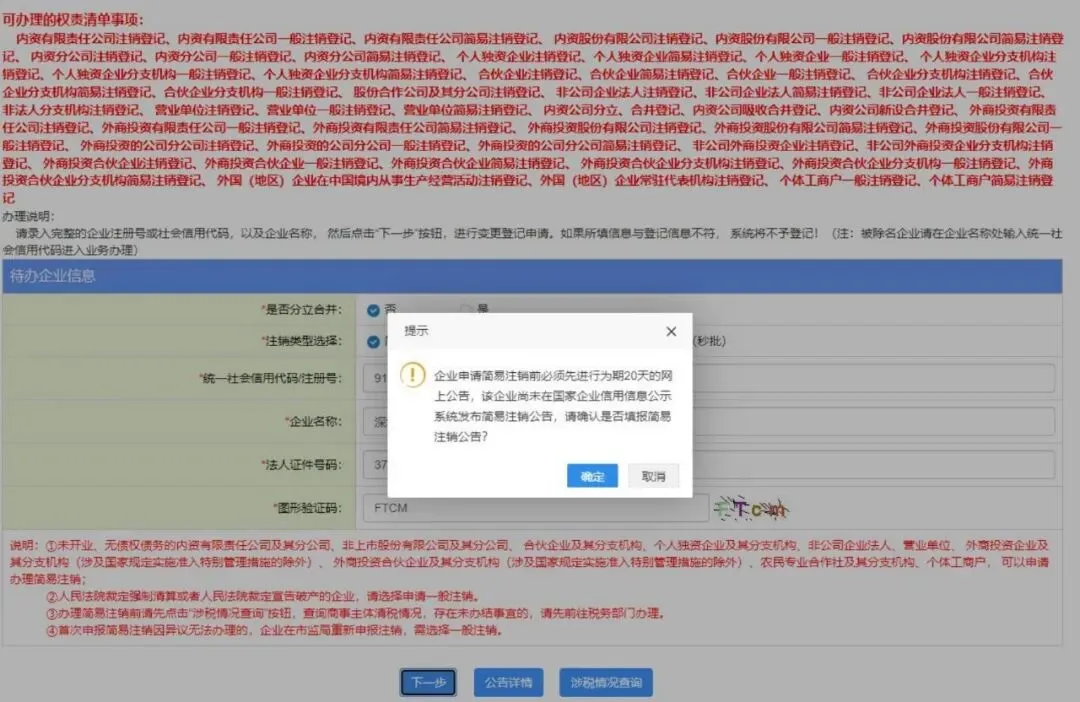 3.填写“统一社会信用代码/注册号、企业名称 、法人证件号码、验证码 ”,点击“下一步 ”,“确定 ”进入系统发布简易注销公告。