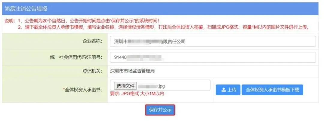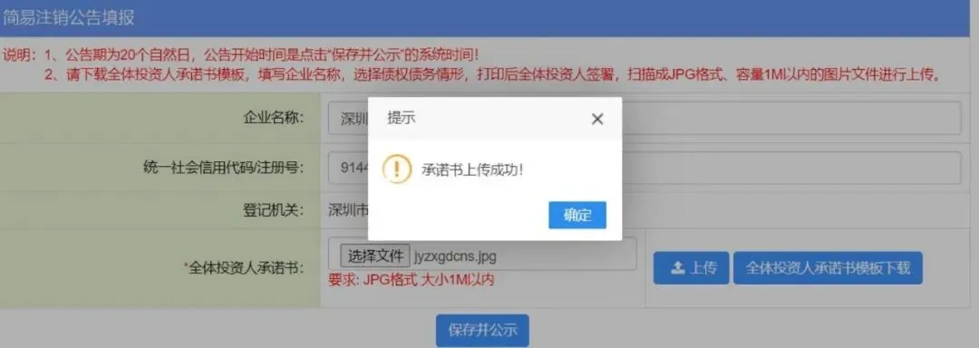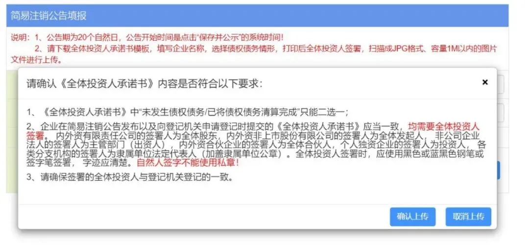 6.请下载全体投资人承诺书模板 ,填写企业名称 ,选择债权债务情形 ,打印后全体投资人签署 ,扫描成JPG 格式 、容量 1M 以内的图片文件进行上传。