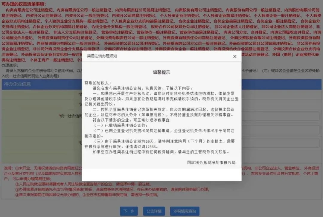 简易公告满 20 天后 ,办理简易注销前请先点击“涉税情况查询 ”按钮 ,查询商事主体清税情况 ,符合登记的可申请简易注销登记 ,操作流程如下: