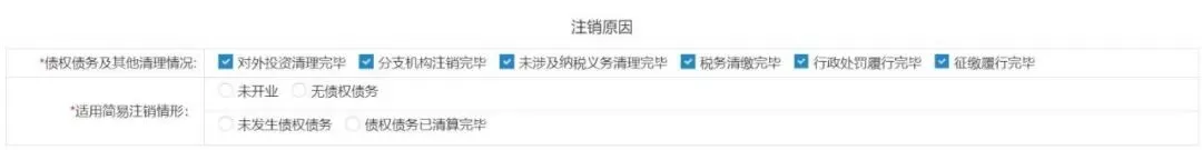 4.“注销原因 ”根据实际情况自行选择“债权债务及其他清理情况 ”、“适用简易注销情形 ”事项。