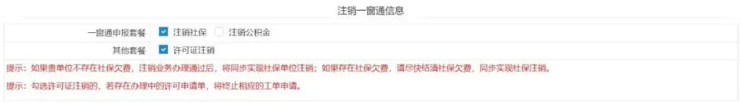 提示:如果贵单位不存在社保欠费 ,注销业务办理通过后 ,将同步实现社保单位注销;如果存在社保欠费 ,请尽快结清社保欠费 ,同步实现社保注销。