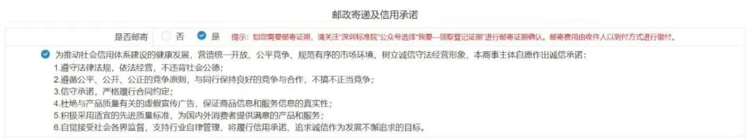6.邮政寄递及信用承诺 , 自行选择是否邮寄 ,邮寄选择“是 ”,否则选择“否 ”。