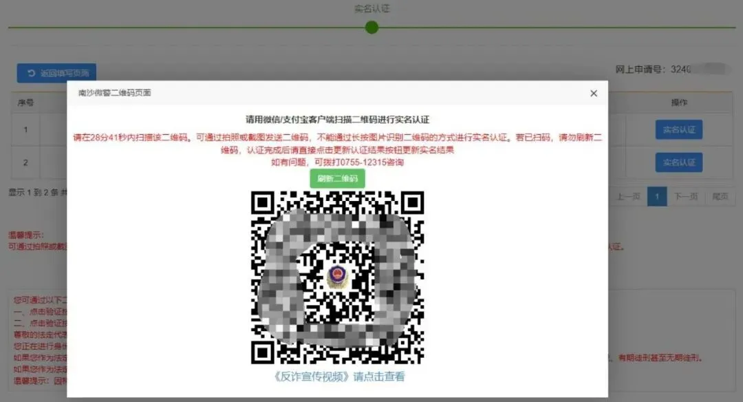 8.点击“实名认证 ”,页面会跳出相应的名认证二维码 ,请使用微信客户端扫描二维码 ,按照步骤提示进行实名认证。