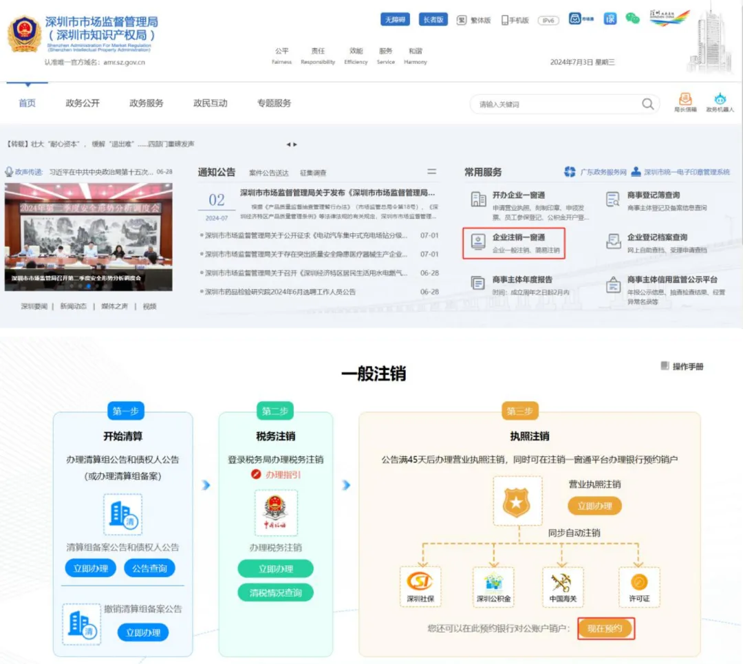 1.登录系统 。① 、登录深圳市市场监督管理局官网 ,点击“企业注销一窗 通 ”;② 、进入“企业注销一窗通平台 ”导航页面 ,找到“预约银行对公账户销 户”入 口 ,点击“现在预约 ”,进入“广东政务服务网 ”的登录页面;③ 、您可选择使用账号、密码登录(无账号的,请先注册账号),或用微信扫描“粤省事 ”小程序码后进行公安部门的人脸识别程序登录 。(注:详细操作步骤请参照第一 节“办理入 口”)