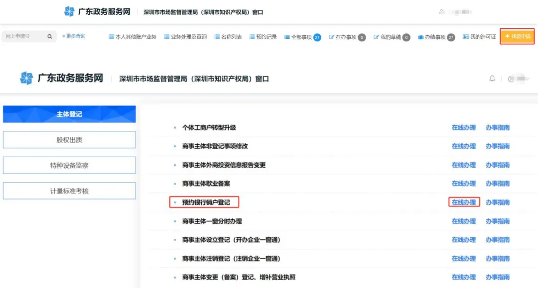 或者通过待办页面 ,点击“我要申请 ”,进入预约银行销户登记。