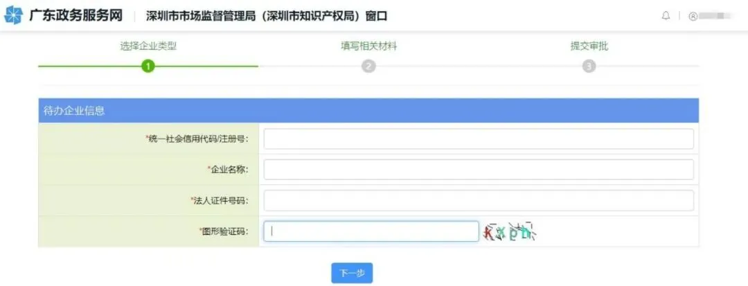 2 .进入申请页面 ,填写“统一社会信用代码/注册号 、企业名称 、法人证件号码 、验证码 ”,点击“下一步 ”。