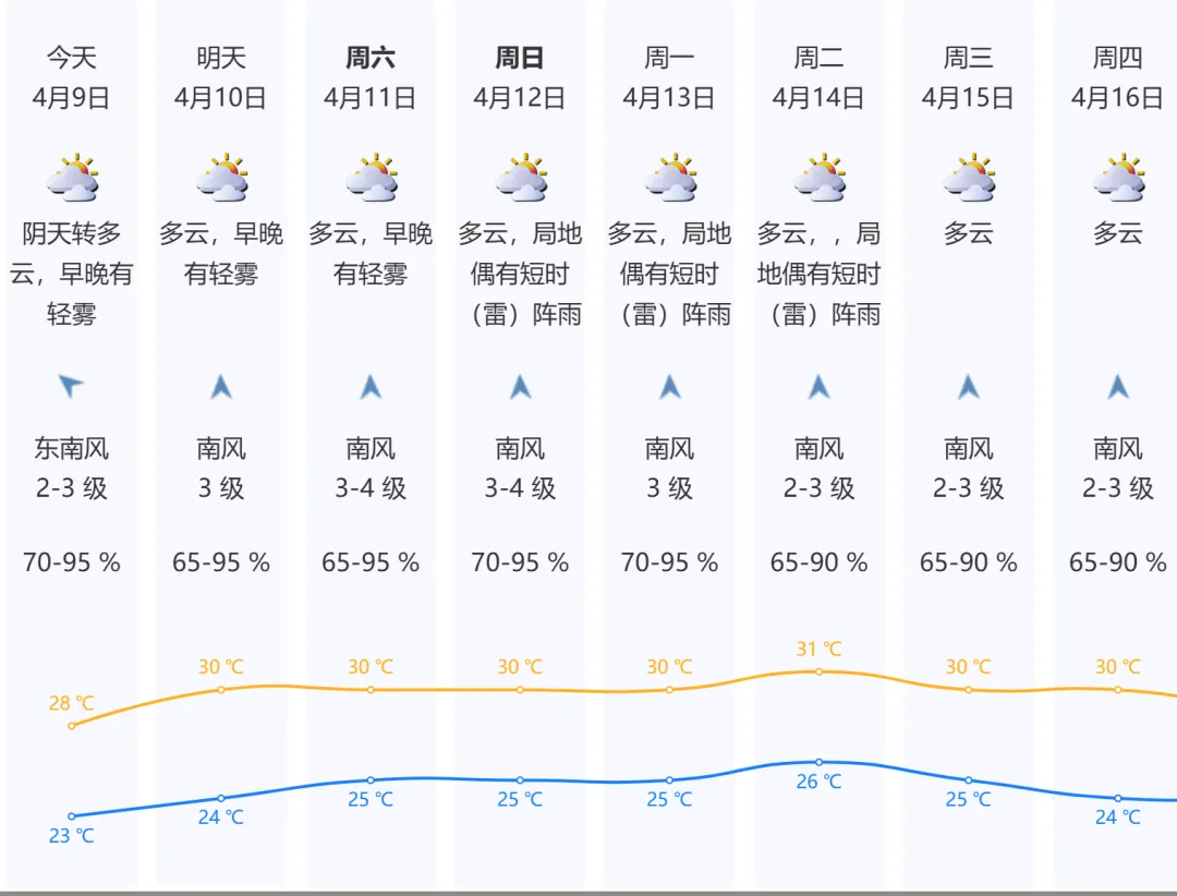 深圳今日阴天转多云,早晚有轻雾;气温23-28℃;东南风2-3级,沿海、高地和海区阵风6级;相对湿度70%-95%。