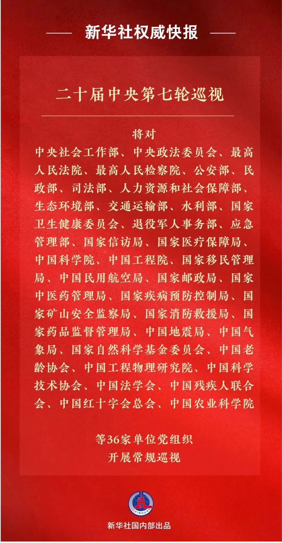 ●二十届中央第七轮巡视将对中央社会工作部、中央政法委员会、最高人民法院等36家单位党组织开展常规巡视。