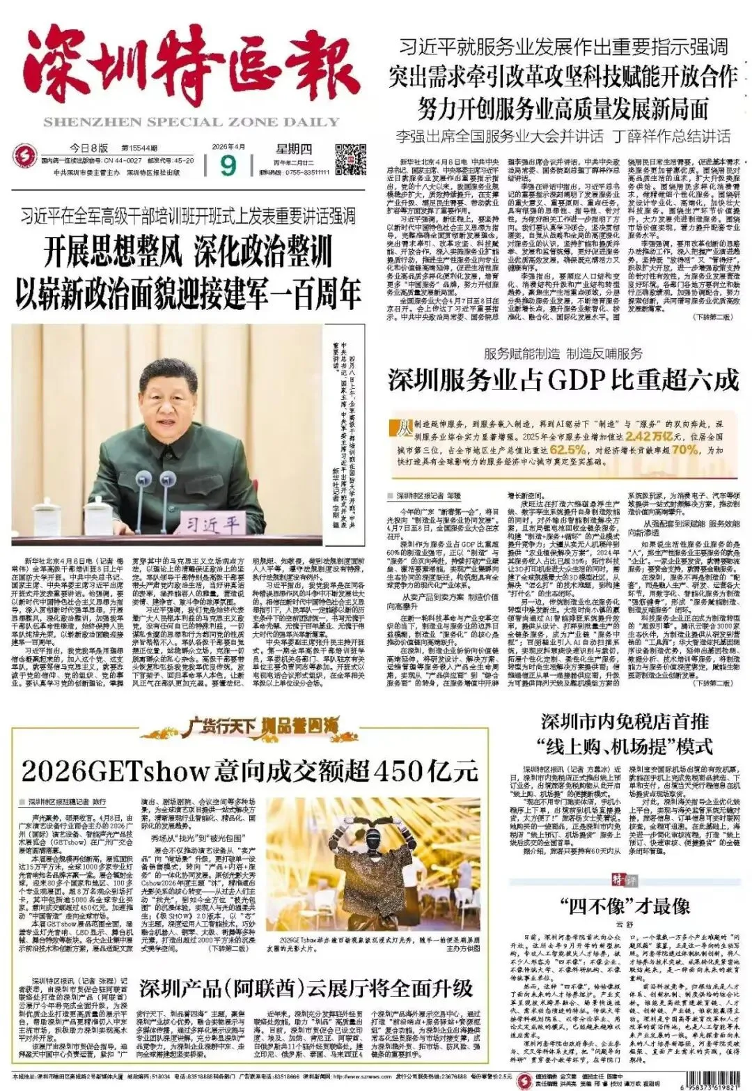 ● 4月7日至8日,全国服务业大会在京召开。深圳服务业占全市GDP比重超60%。2025年全市服务业增加值达2.42万亿元,位居全国城市第三位。