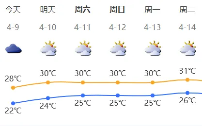 4月9日,阴天转多云,早晚有轻雾;气温22℃—28℃;东南风2级—3级,沿海、高地和海区阵风6级;相对湿度70%—95%。