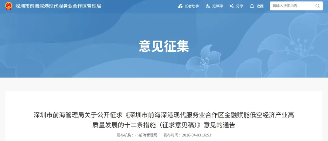 ■ 「低空经济观察」获悉,深圳市前海管理局发布《深圳市前海深港现代服务业合作区金融赋能低空经济产业高质量发展的十二条措施(征求意见稿)》。文件围绕低空经济发展的全产业链、全生命周期需求,结合前海深港跨境特色,提出构建低空经济产业全生命周期保障体系、赋能低空经济产业强链补链、培育壮大前海低空经济市场主体、鼓励创新低空经济应用场景、助力低空经济企业拓展海外市场、打造低空经济产业生态服务体系六个方面共十二条具体措施。